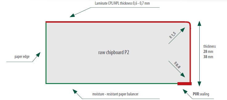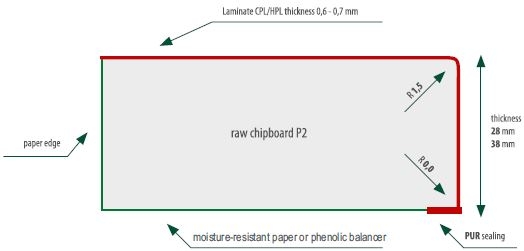 - Powierzchnia: laminat CPL/HPL 0,6 do 0,7 mm zgodnie z normą EN 438
