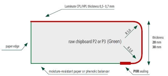 - Materiał bazowy: płyta wiórowa P2 zgodnie z normą EN 312; standardowo P3 grubości 38 mm