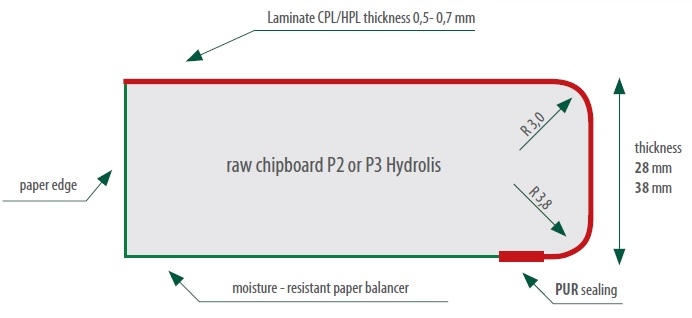 - Powierzchnia: laminat CPL/HPL 0,5 do 0,7 mm zgodnie z normą EN 438